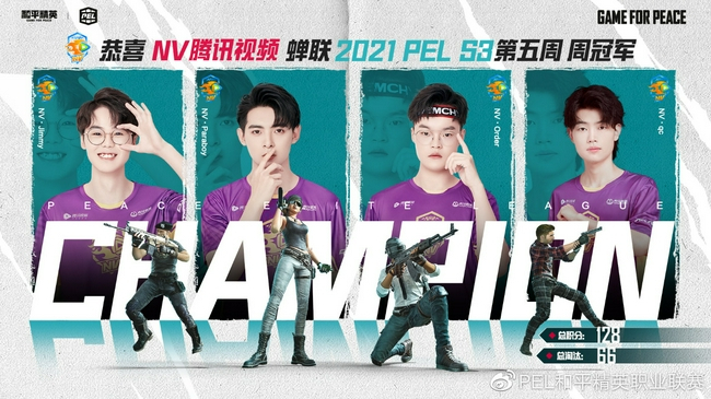 9月26日,2021PEL和平精英职业联赛S3赛季第五周周决赛结束,经过5场比赛的激烈角逐,NV凭借最后一场比赛最后时刻伞兵的一穿二淘汰TC,NV追回8分的落后劣势,虽然他们与TC的积分同为128分,但NV凭借着66-57的淘汰数力压TC,收获两连周冠军,再次斩获百万周冠军奖金,NV·伞兵拿下第五周周决赛 MVP。