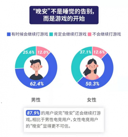 此外,这份报告也透露了一个很有趣的数字,87.9%的用户说完‘晚安’还会继续打游戏。 相比于男性电竞用户,女性电竞用户的 ‘晚安’显得更不可信,真是人人都爱打游戏啊!