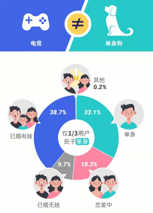 一直以来,社会上存在一种说法,认为只有‘单身狗’才喜欢打游戏。但据本次调研,接近一半的电竞用户已组建家庭,其中38.7%的用户已为人父母,只有33%的用户才是单身,也证明了‘只有单身狗才打游戏’的说法站不住脚。