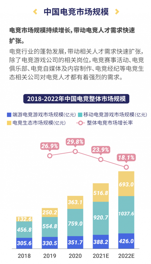 报告显示,2022中国电竞整体市场规模预计将达到2157亿元,其中端游电竞市场规模为426亿,手游电竞市场规模为1038亿。2020年,中国电竞用户规模已达到5亿,说明作为新兴文化符号的电竞, 在大众群体中愈加流行。