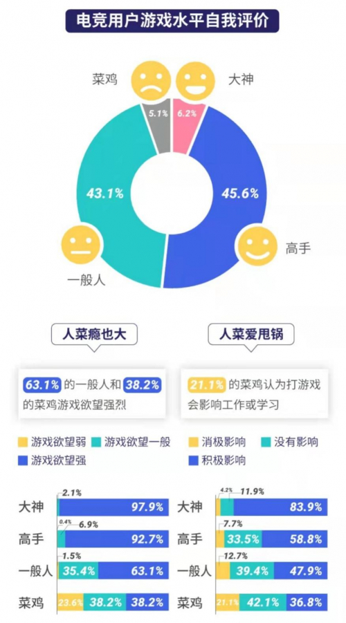 那么,摆脱了单身的‘偏见’,电竞用户对自己打游戏的水平有什么认识呢?