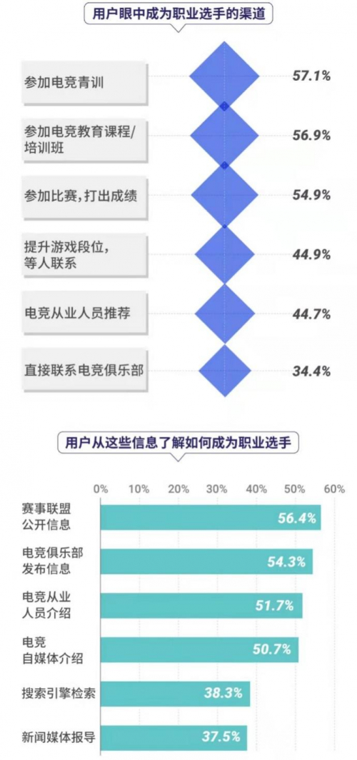 对于大部分梦想着成为职业选手的年轻人,他们会通过各种方式了解成为电竞选手的信息,超过一半的用户认为,参加电竞青训是成为职业选手最有效的方式。此外,有44.7%认为提升段位,就会有人来联系自己,从而打开进军职业的大门。这种说法也不无道理,在调研过程中,一位职业选手就表示自己段位达到很高的水平,就有战队教练来联系,从而成为了一名职业选手。