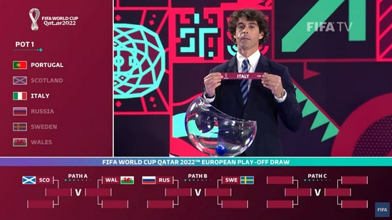 意大利队和葡萄牙队先后被抽入C组。意大利先主场迎战北马其顿,葡萄牙迎接土耳其挑战。若两队均过关,随后将在葡萄牙主场决一死战,争夺一张世界杯门票。