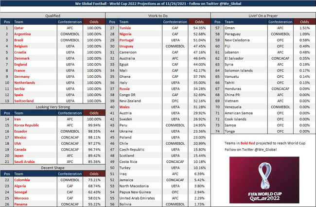 著名大数据外媒《we global football》在抽签后列出了参加附加赛的几支球队晋级世界杯的概率。