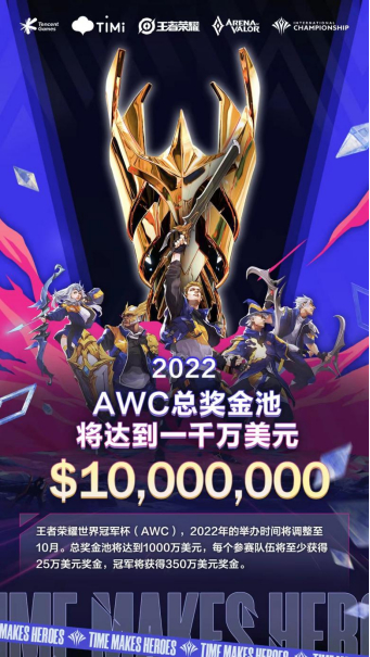 作为王者荣耀电竞规格最高的赛事,万众瞩目的王者荣耀世界冠军杯(AWC)将在2022年10月举行,来自全球各地的16支队伍将共同吹响号角,向高达1000万美元的总奖金池发起冲击。每一个进入正赛的战队,将获得至少25万美元的奖金,冠军将获得350万美元!