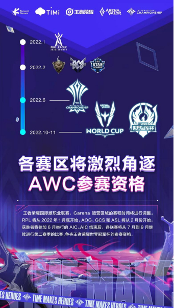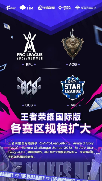 职业赛事方面,为迎合国际赛事的时间安排,王者荣耀国际版职业联赛Garena运营区域的赛程时间将进行调整。其中,RoV Pro League(RPL)赛区将从2022年1月底开始第一赛季,而Arena of Glory(AOG)赛区、Garena Challenger Series(GCS)赛区和AoV Star League(ASL)赛区则从2月份开始第一赛季的比赛,获胜者将提前锁定AIC 2022国际邀请赛的席位。