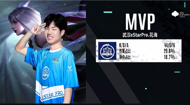 武汉eStarPro本局比赛的发挥出了清晰的战术思路,前期连续入侵野区直接拿下优势,随后完美滚雪球,拿下胜利,花海打出14-0-6的完美数据。