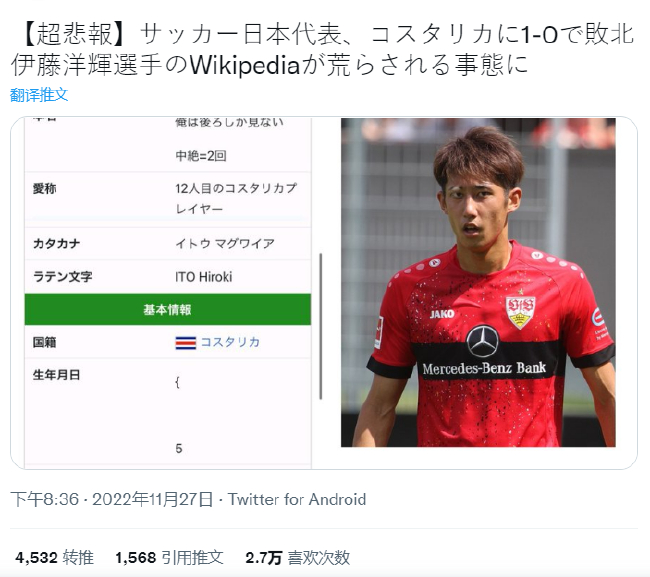 本场比赛首发的球员伊东洋辉遭受了网暴。他的维基被一些球迷进行了胡乱涂改。