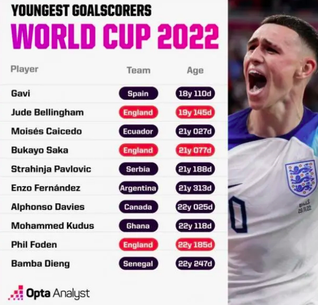 Opta统计了本届世界杯进球球员的年龄,并排出最年轻进球者榜单,加维以18岁110天的年龄居首,贝林厄姆排名第二,前10位有3名英格兰球员。