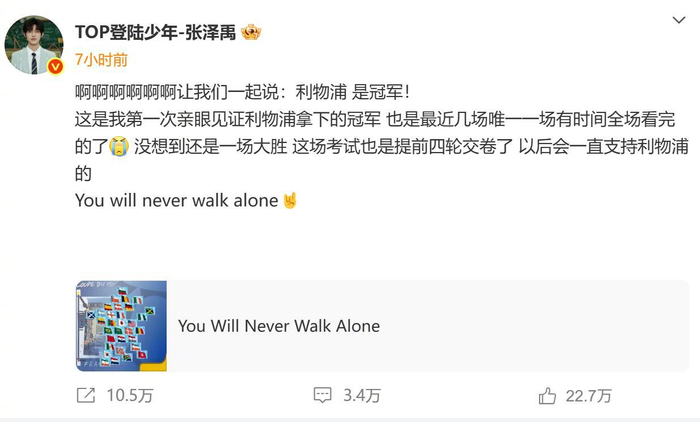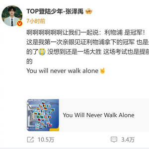 艺人@TOP登陆少年-张泽禹 也更新了微博,发文庆祝利物浦夺冠!#张泽禹恭喜利物浦夺冠#