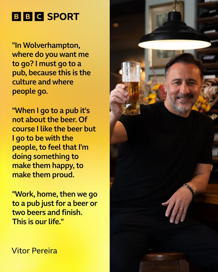 沃尔弗汉普顿属于英格兰中部黑村地区(Black Country),此地民风淳朴,大家下班后喜欢去酒吧消遣。佩雷拉每次赢球后,都会去市中心酒吧和球迷一起喝酒庆祝,他在一次发布会上说出的金句:First the points, then the pints(先拿三分再喝酒),被球迷做成了Tifo.