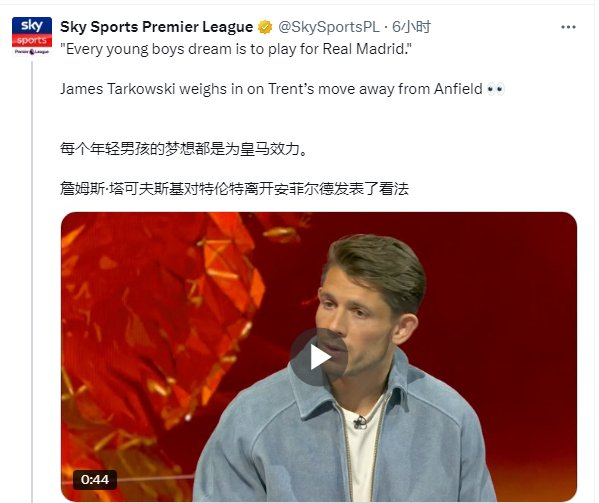塔可夫斯基:是的,我没有那么幸运能为我儿时支持的俱乐部效力,也没有赢得他所赢得的那些荣誉,也没有做到他所做到的事情。我认为每个年轻男孩的梦想都是为皇家马德里踢球,而不是世界上的其他任何俱乐部。我觉得他们是世界第一的俱乐部,就像杰米说的那样,所以这显然是吸引他的唯一原因。