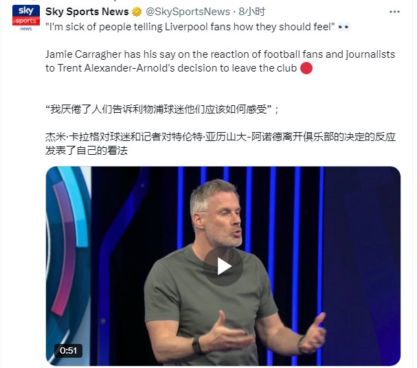 卡拉格:嗯,我现在是一名利物浦球迷,但我曾经也是利物浦的球员。利物浦的球员,尤其是本土球员,会以不同的方式受到更高的关注,因为在这种情况下,本土球员和球迷可能会对他们有更多的期望。我并不总是认同在某些情况下利物浦本土球员所受到的待遇,因为就像我说的,我曾经也是一名球员,处于那样的位置。但对于特伦特这件事,这是他的职业生涯,你知道的,他有自由选择自己想做的事情,而且他要去的是世界上最大的俱乐部。我更多的不是生气,而是失望,因为作为一名本土球员,当利物浦正在不断赢取胜利的时候,他却认为利物浦不够好。我们过去也有球员离开,比如史蒂夫·麦克马纳曼、迈克尔·欧文,史蒂文·杰拉德差点也离开过,但那是因为他们当时效力的利物浦队没有现在这支球队这么强大。现在这支利物浦队可以说是欧洲最好的五六支球队之一,刚刚赢得了英超冠军,而且在未来的五六年里,在新教练的带领下,利物浦可能即将迎来一些非常特别的成就。所以对我来说,如果我是一名本土球员,处于他那样的位置(当然我从来没有过,从来没有像皇家马德里和巴塞罗那这样级别的球队来邀请过我),但如果我在利物浦处于他那样的位置,并且认为我可以在这里赢得联赛冠军,可以让利物浦在联赛冠军数量上超过曼联,可以努力缩小与皇家马德里的差距,因为人们总是谈论英格兰国内的竞争,你不能去曼联,不能去切尔西,不能去阿森纳,而皇家马德里是利物浦在欧冠赛场上的对手。