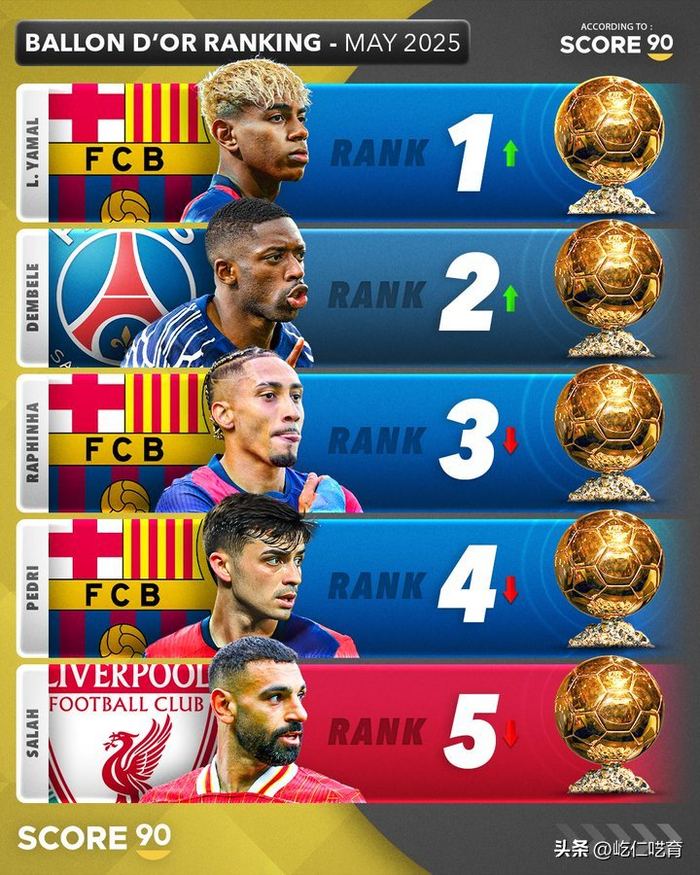 在SCORE 90给出的最新金球奖预测排名中,亚马尔、登贝莱和拉菲尼亚排名前三。而榜单所发布的时间5月12日,其实欧冠半决赛早已结束但巴萨还未曾在西甲夺冠。