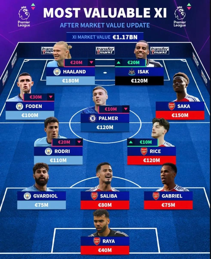 德国转会市场评选了英超身价最高首发阵容,阿森纳有拉亚、加布里埃尔、萨利巴、赖斯、萨卡五人上榜。