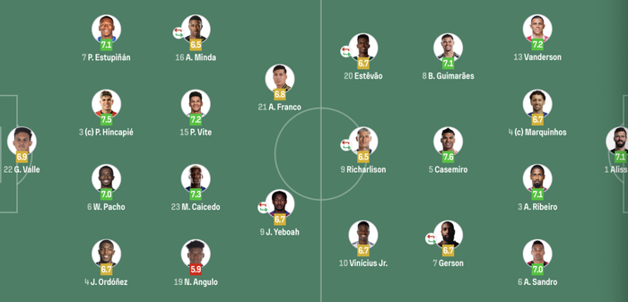 巴西(433):1-阿利松;13-万德森,4-马基尼奥斯,3-里贝罗,6-桑德罗;8-吉马良斯,5-卡塞米罗,7-热尔松(78’18-安德烈);20-埃斯特旺(64’22-马丁内利),9-理查利森(64’21-库尼亚),10-维尼修斯