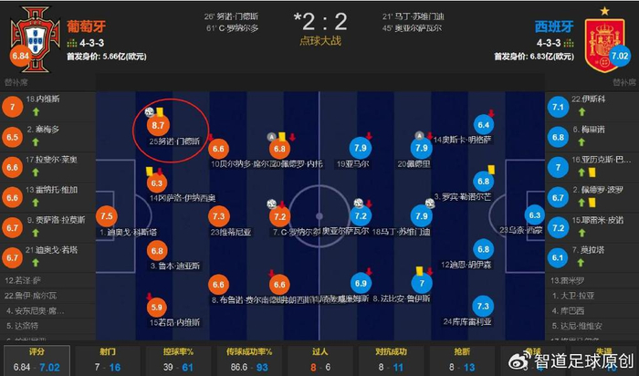 为什么亚马尔火爆了整个赛季,而他在欧国联的决赛中哑火了呢?因为葡萄牙有欧冠冠军级别的左后卫门德斯,他把亚马尔防守得怀疑人生。数据是冰冷的,但最能说明问题。葡萄牙左后卫门德斯对位西班牙右边锋亚马尔,门德斯不仅完全把亚马尔焊死了,完成防守任务的同时他还打入一球。门德斯赛后不仅获得了全场最高的8.7分,也是两队出场球员唯一的一个8.0+分,并当选了此役官宣的全场最佳球员。