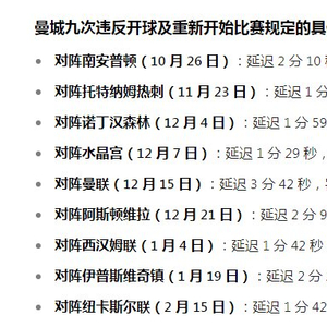 2024年12月15日曼城主场对阵曼联的比赛中,开球和中场休息后重新开始比赛均出现延迟,总计延迟3分42秒。