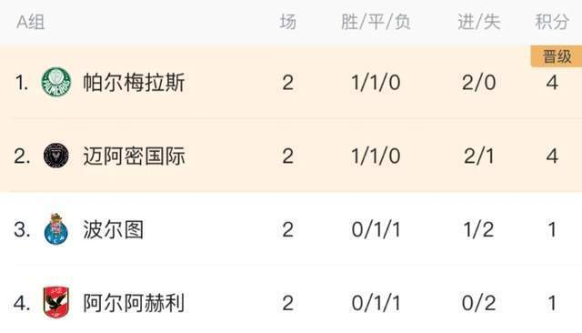 帕尔梅拉斯拿1分即可获得小组头名——同分情况下,两队相互战绩相同,再比较净胜球,帕尔梅拉斯占优。因此,巴西豪门没有死磕迈阿密国际的必要。