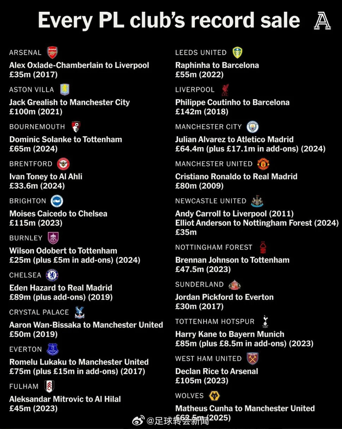 卖人确实太差了,要知道布伦特福德、桑德兰和伯恩利甚至并不都一直是英超球队,纽卡斯尔数年前也有降级经历,阿森纳作为一直在英超打拼的俱乐部,且是强队,最高卖人费用只和这些球队为伍,实在值得反思。