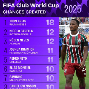 7月11日讯本届世俱杯仅剩巴黎vs切尔西的决赛,数据机构squakwa也统计了本届赛事创造机会情况,弗鲁米嫩塞的27岁前锋琼-阿里亚斯独自领跑。