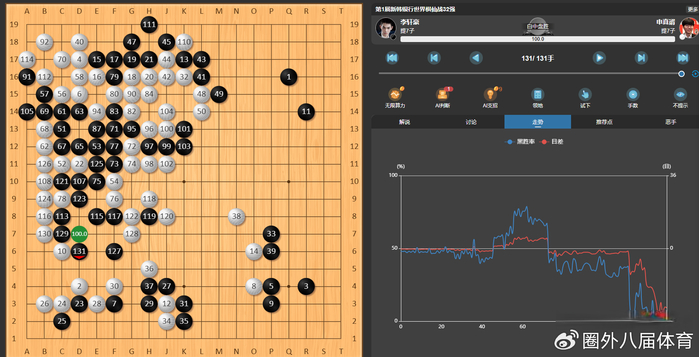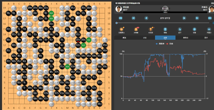 25日下午,中国队最后一名棋手党毅飞对阵日本棋手村川大介。这盘棋下得很顺利,党毅飞执黑先行,村川大介在第72手长考之后下出臭棋,随后胜率节节败退,至106手,村川大介胜率抵达0%。坚持到212手,党毅飞中盘获胜晋级16强,为中国队最后挽回一点面子。