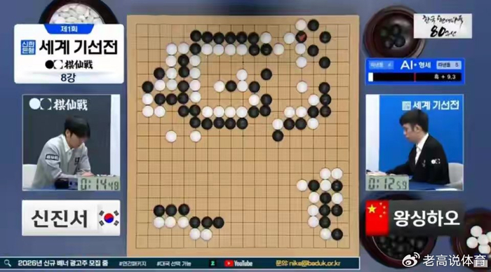 党毅飞这边获胜不久,另外一场比赛小申也扛不住了。两人的布局阶段,执白棋的申真谞一度取得58%的胜率。但随着王星昊在左上方打入,对白棋展开围攻,至第66手王星昊的黑棋胜率已升至60%。白棋第92手选择开劫成为胜负转折点,黑棋胜率飙升至90%以上。到第259手,申真谞看到差距过大,已无力回天,直接中盘认输。至此,韩国大小申被中国两将团灭出局。