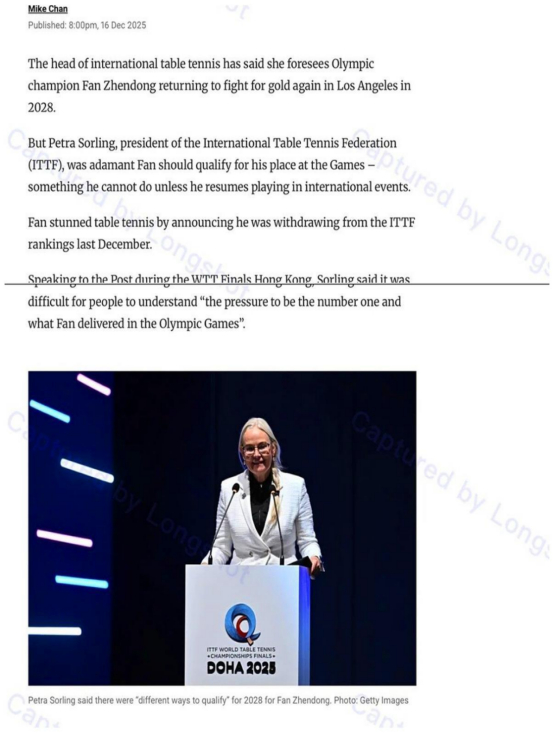 在12月16日,国际乒联主席索林喊话,小胖要是想参加二八年的洛杉矶奥运会,只有两个选择。