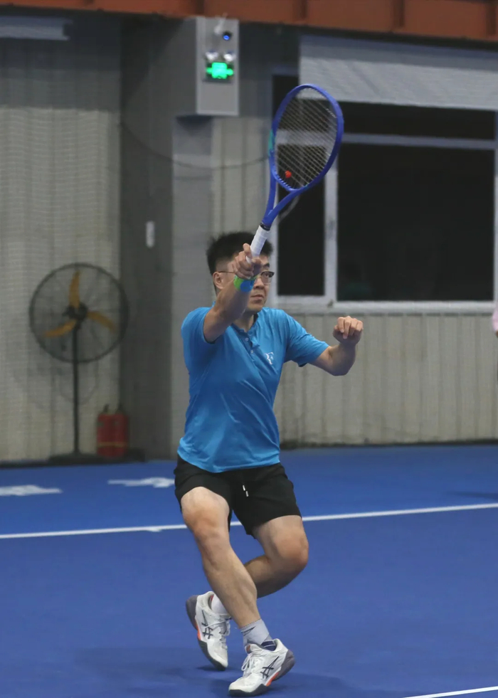 他是球场上的“微笑战神”。无论比分领先还是落后,他的脸上总挂着笑容,从他的表情里,读不出丝毫输赢的焦虑。这份从容,恰恰契合了业余网球的初心——健康与快乐。他从不会因为搭档的失误而面露愠色,反而会主动揽责:“是我打得质量不高,给了对方进攻机会。”和他搭档,你永远不会感到压力,只会沉浸在并肩拼搏的乐趣里。更难得的是,他从不“嫌贫爱富”,愿意带着技术生疏的球友上场,耐心指导,毫无保留。喜欢打球的大多球友都喜欢和比自己水平高的选手搭档,就是大家口中的“抱大腿”,和“大腿”搭档不仅能赢球、还能更过瘾。所以,豆哥能主动带比自己水平差的球友比赛,万分难得。