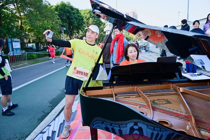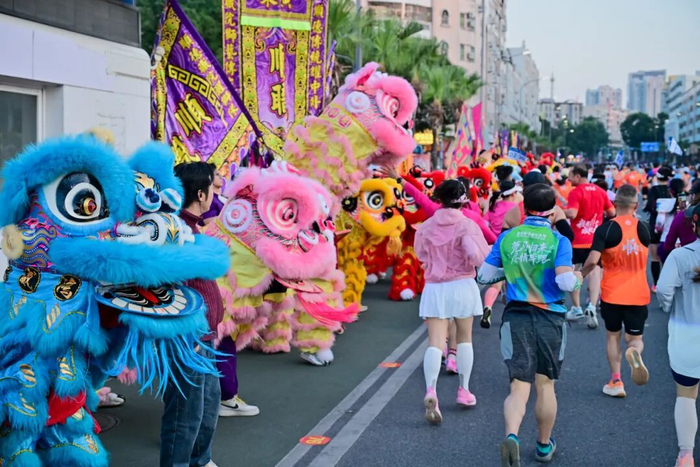 赛道沿途设置超过70个氛围点,从气势恢宏的“百狮阵”,到全民K歌舞台、声浪能量站等,“助威天团”纷纷拿出“看家本领”为跑友呐喊加油。沿途还有独具特色的岸龙展示、塔香展示、书画长廊等,构成了绵延42公里的“露天文化长廊”,让跑者在奔跑中沉浸式感受岭南风韵。