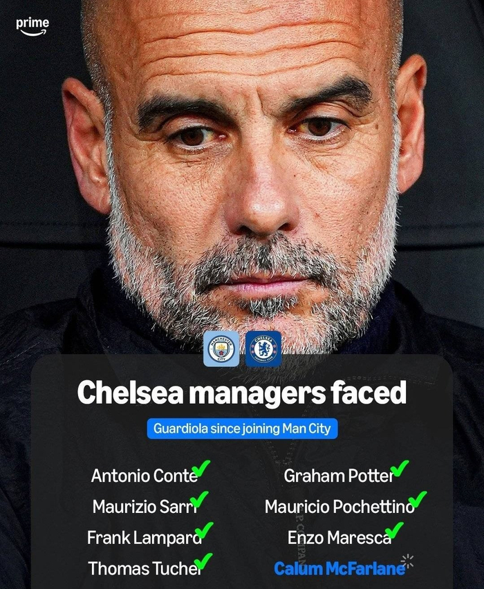 瓜迪奥拉将迎执教曼城以来第8位切尔西主帅