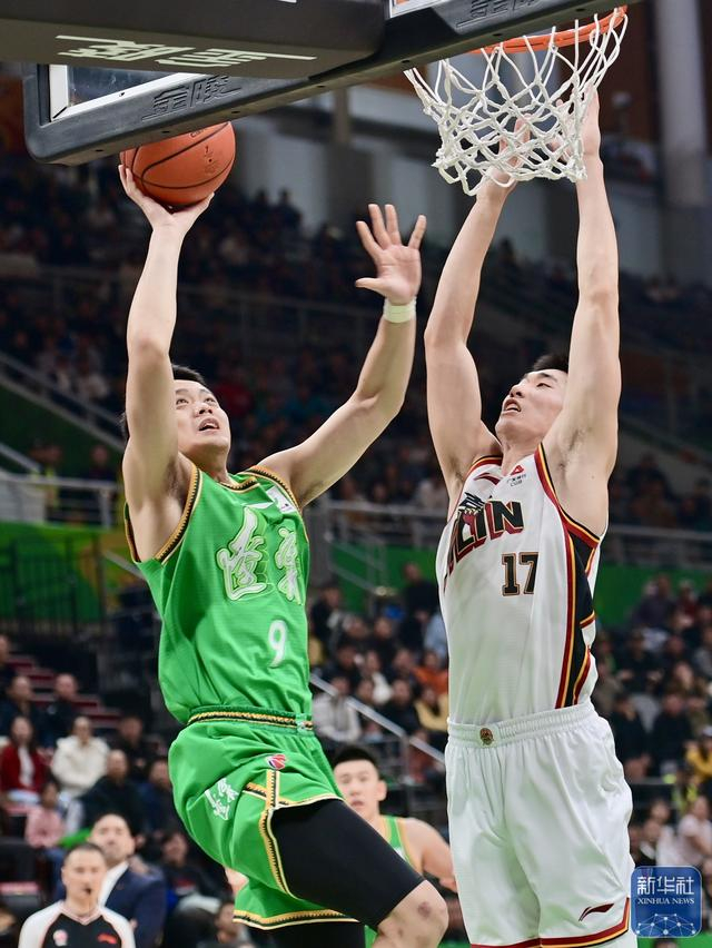 ↑ 辽宁本钢队球员姜宇星(左)在比赛中上篮。