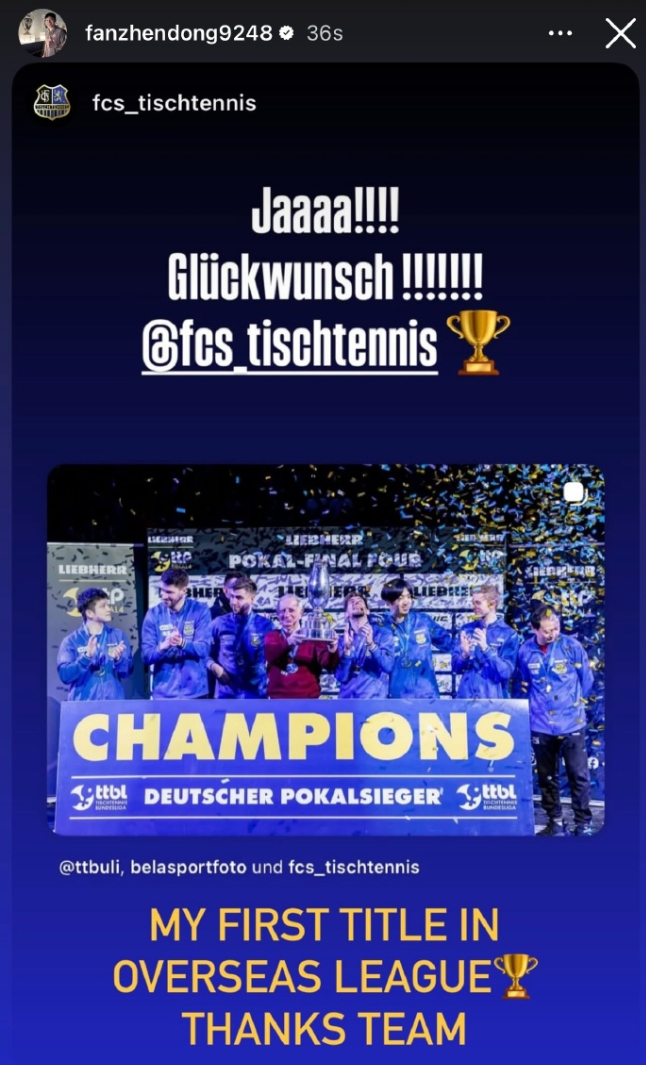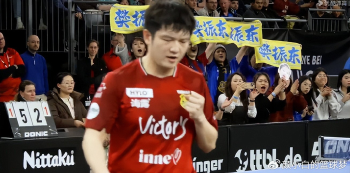 赛后樊振东在个人的IG上发布了自己夺得德国杯冠军的消息,小胖让出了合影的C位,小胖真的是一位超级优质的偶像,全场5000多位观众一同为他唱起了中文歌曲。