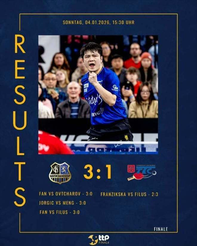 德国杯是欧洲比较有影响力的商业联赛,吸引了来自世界各地的名将加盟,就包括国乒大满贯、超级全满贯樊振东。此前的半决赛,樊振东迎来新年首秀,他率队3-1逆转击败了卫冕冠军奥克森豪森,晋级决赛。