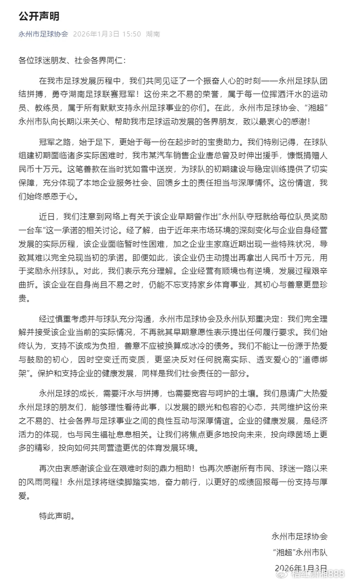 然而,故事并未止步于夺冠的狂欢。赛前某企业老板“夺冠每人送车”的公开承诺,在胜利后陷入沉默,旋即演变为一场关于“承诺是否必须兑现”的舆论风波。若仅从契约角度看,这似乎是一道是非题。但永州足协与球队的公开回应,却展现了一种更为成熟、更具远见的思考维度:“支持不该成为负担,善意不应被换算成冰冷的债务。”他们看到了当初那份鼓励在艰难时刻带来的精神支撑,也体谅企业可能面临的实际困境。这种以理解回应善意、以宽容呵护热情的姿态,让一场潜在的“讨债”纠纷,升华为一段“双向奔赴”的美谈。