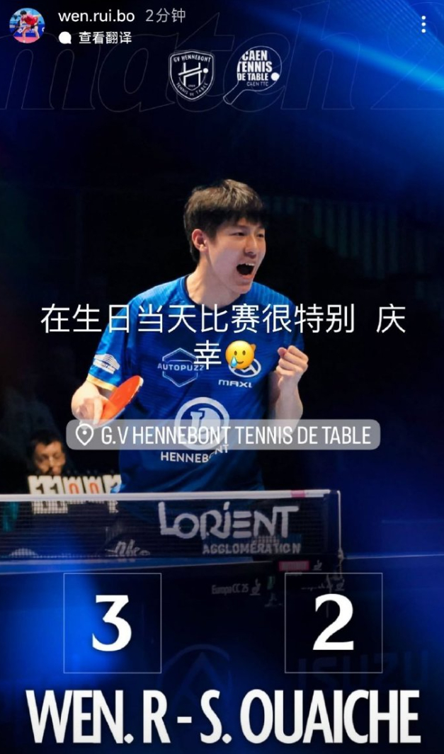 北京时间1月5日,法甲联赛第八轮,亨尼邦俱乐部3-0击败卡昂俱乐部,这场比赛温瑞博出战第三盘,他的对手是瓦伊什,最终温瑞博是3-2险胜瓦伊什,温瑞博个人也在IG上发布了自己生日夜逆转的消息,温瑞博赢下了荡气回肠的一战,五局比分:13-11、11-8、3-11、8-11、14-12。
