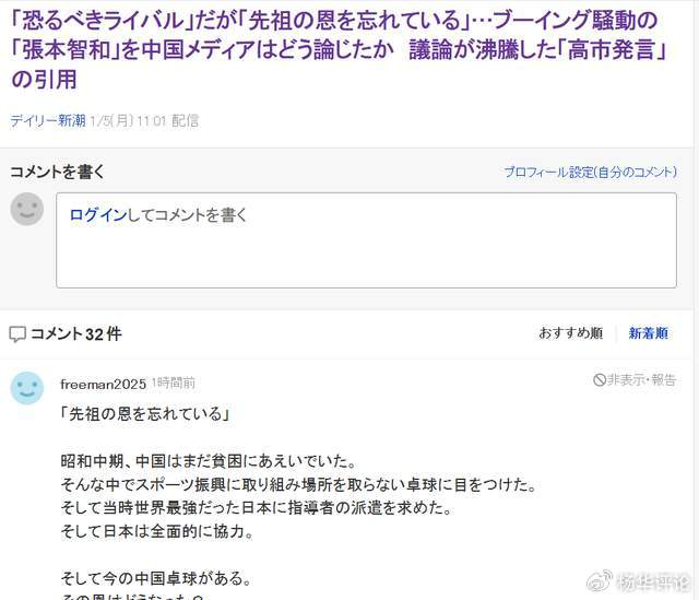 新潮社的报道点燃日本网友讨论热情,大部分网友留言将矛头指向中国。有日本球迷反驳称,真正忘恩负义的不是张本智和,而是中国乒乓球队,忘记了荻村伊智朗等日本名宿的帮扶之恩——当年中国乒乓落后时,正是日本分享海绵球拍技术、推动中国重返国际赛场。