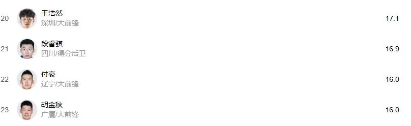 大前锋王浩然前十轮比赛场均17.1分排名本土得分榜第三,42%命中率的精准三分,加上出色的移动和篮板能力,21岁的他年轻有为,也值得入选国家队集训名单,他的培养价值甚至能超越胡金秋。
