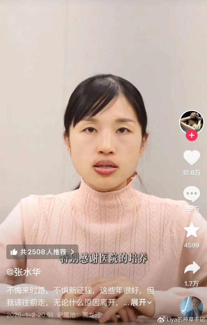 2026年1月2日晚上,张水华在社交平台上传了一段视频,宣布自己辞去了医院的工作。