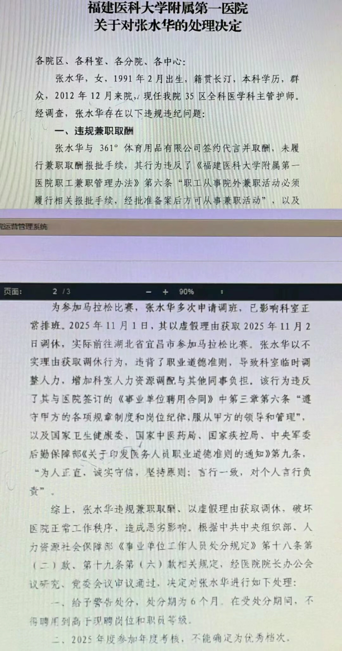 医院在通报里说得挺清楚:张水华与361°体育用品有限公司签约代言并取酬,却没按规矩走报批流程;为了跑马拉松,她用不实的理由调休,影响科室正常排班。