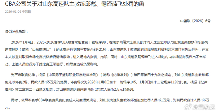 为严肃联赛纪律,根据《中国男子篮球职业联赛纪律准则》第四章第四十九条之规定,对山东高速队主教练邱彪处以停赛2场、罚款5万元的处罚,停赛场次为2026年1月6日第十一轮场序105、1月9日第十二轮场序119的比赛。根据《纪律准则》第二章第二十四条之规定,对山东高速队翻译薛飞处以罚款2万元的处罚。