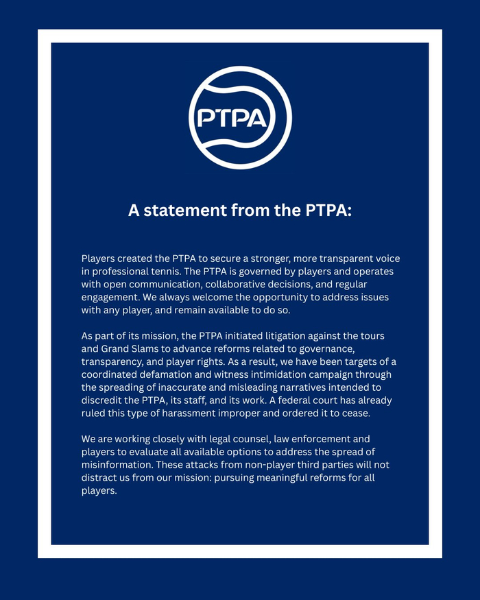 声明中写道:“作为使命的一部分,PTPA对巡回赛组织和大满贯赛事提起诉讼,以推动与治理、透明度和球员权益相关的改革。正因如此,我们成为了一场有组织的诽谤和证人恐吓行动的目标,通过传播不准确、具有误导性的叙事,意在抹黑PTPA、其员工以及我们的工作。”