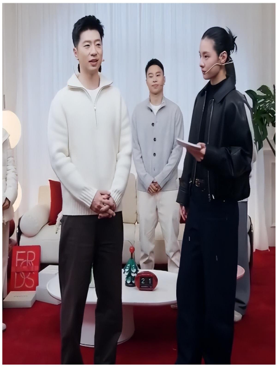 一众明星身处喧嚣之际,马龙身穿白色毛衣现身直播间。