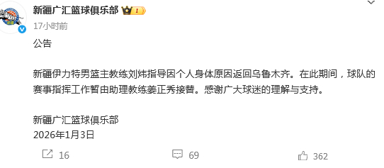 新疆男篮主帅刘炜过去6场比赛输球5场,一波3胜6负的开局同样引发教练组变动,根据新疆官方社媒的公示,刘炜将会退出主帅的位置。有消息称目前正在新的主帅筛选工作,前男篮助理教练格兰成为潜在人选。