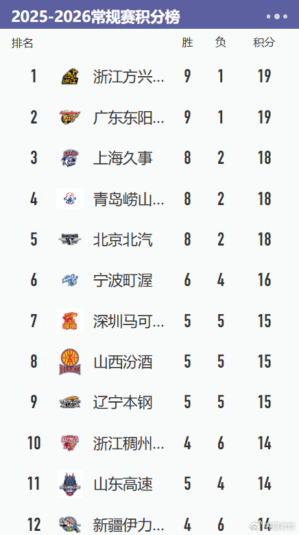 积分榜第4名的是青岛队,他们的战绩是8胜2负。而北京队在接连输球后,他们的战绩变成8胜2负,排名也从积分榜第一名,下滑到积分榜第5,暂时跌出前四名。积分榜第6名则是宁波队,他们的战绩是6胜4负,从本赛季前10轮的表现来看,宁波队确实是当之无愧的黑马。积分榜第7名则是深圳队,他们的战绩是5胜5负。排在第8名则是山西队,这一轮比赛他们大胜江苏队,成功结束连败。目前,他们的战绩是5胜5负。