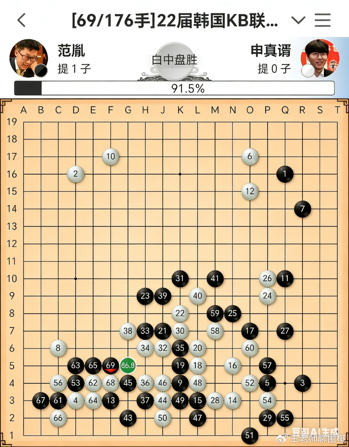 令人扼腕的一幕,紧接着上演。或许是意识到自己此前的用力过猛,或许是面对申真谞名号的残余压力,范胤在获得主动权后,行棋突然变得迟疑而保守。第67手与69手,成为本局最为关键的败着!这两步棋,宛若在激流中突然收桨,意图稳住小船,却不知已偏离了唯一通向胜利的航道。AI胜率研判显示,这两手棋径直导致白棋胜率暴跌近70个百分点,一场苦心经营甚至略带运气成分获得的领先优势,顷刻间烟消云散。