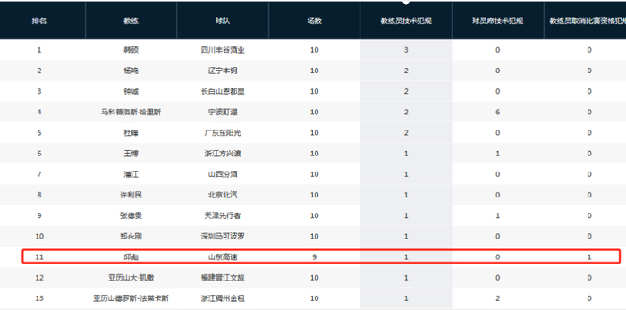 而在取消比赛资格犯规方面,邱彪成为唯一被驱逐的主帅,引发球迷和媒体的热议。