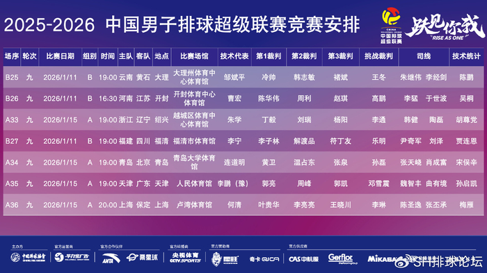 2025~2026中国男排超级联赛第九轮竞赛安排