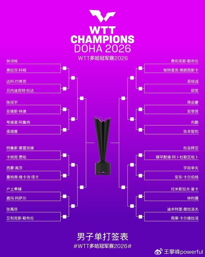 WTT多哈冠军赛抽签结果,男单签位不理想,夺冠形势严峻