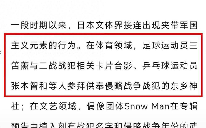 《学习时报》那篇文章点出了一个更深层的问题:张本智和不是一个人在做这些事,他的行为是日本极右翼势力有组织渗透的一部分。 这些人专门利用体育、文艺这些大众喜闻乐见的形式,悄咪咪地给军国主义思想“洗白”,影响年轻人对历史的认知。 文章里还举了别的例子,比如日本足球明星三笘薰和印有战犯的卡片合影,偶像团体在MV里用带有侵略战争年份的武士刀道具。